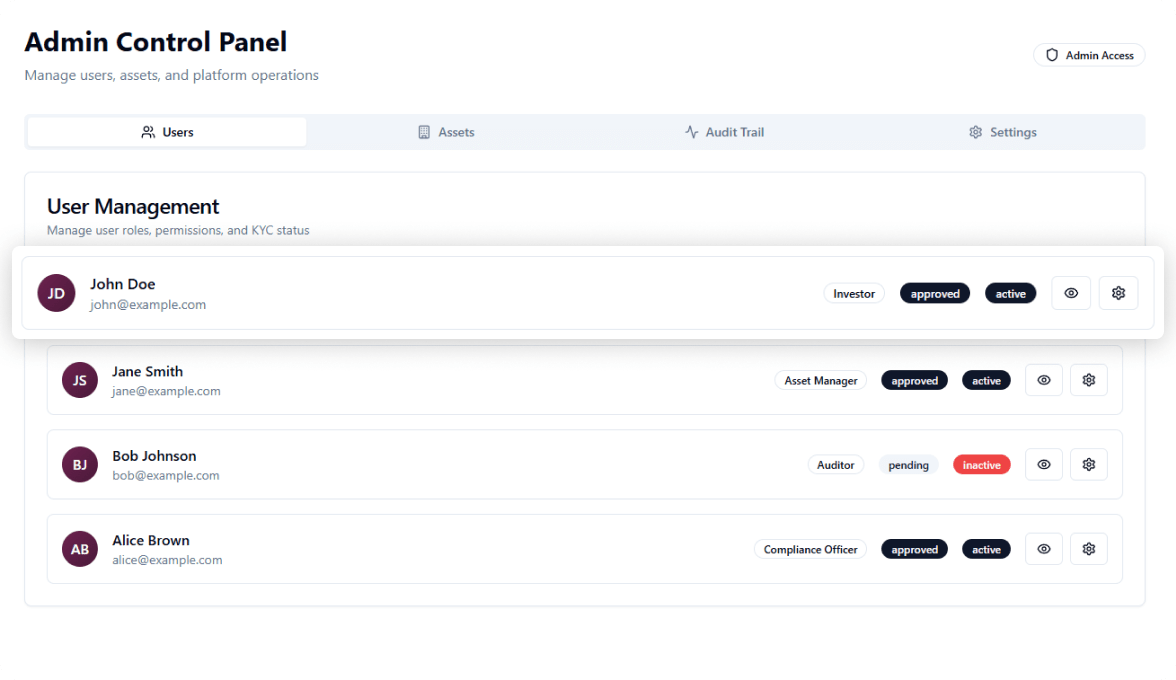 Defined roles for investors, asset managers, auditors, and compliance officers to streamline platform operations.